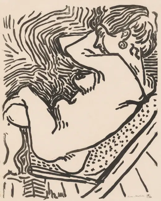 《戴手镯的裸女》展现了亚麻油毡版画的基本优势:柔软的材料易于雕刻出流畅连贯的线条。这幅作品通过将雕刻完成的图版施以黑色油墨,最终印于白纸上完成。