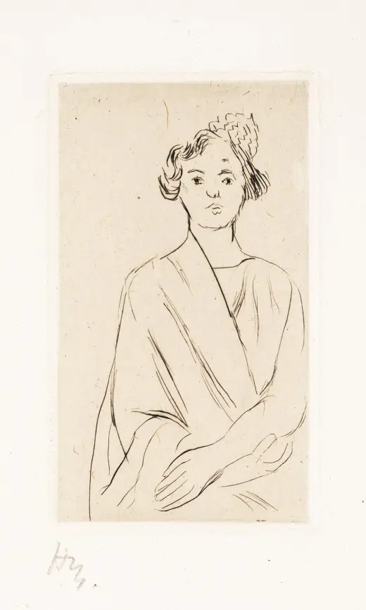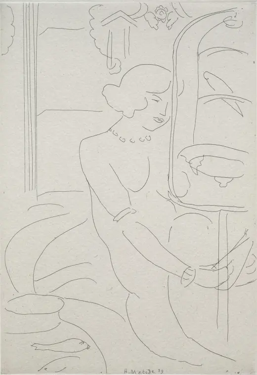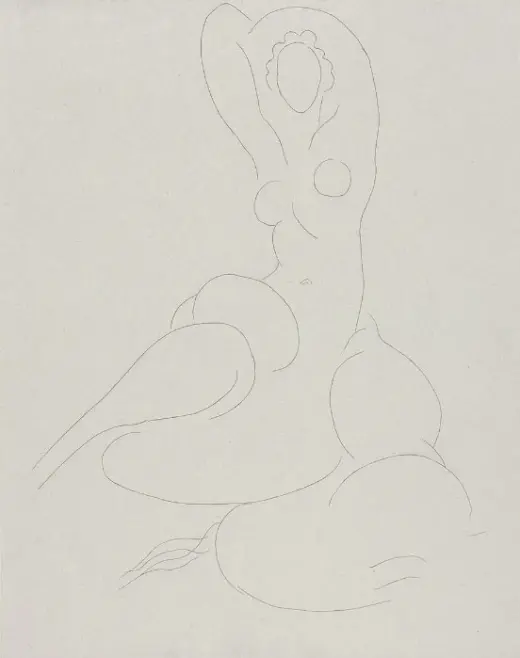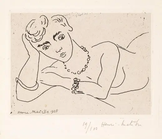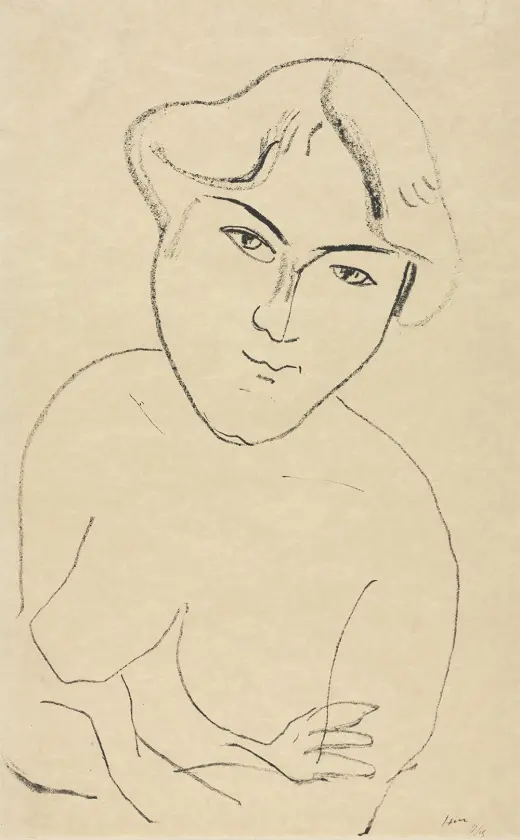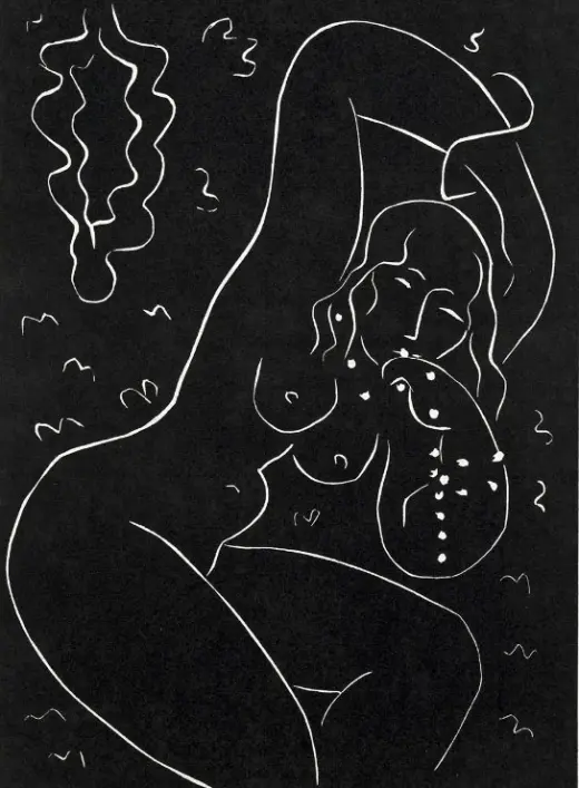Nude with Bracelet exemplifies the basic advantage of linoleum cutting: the soft material makes it easy to produce a continuous, fluid line. The image was cut from the block, the surface was inked in black, and it was printed on white paper.