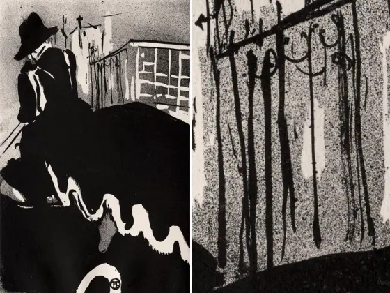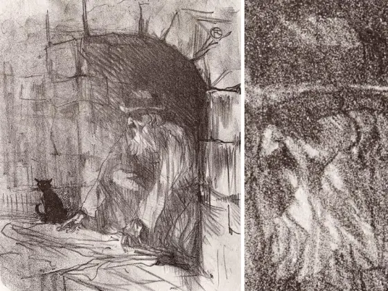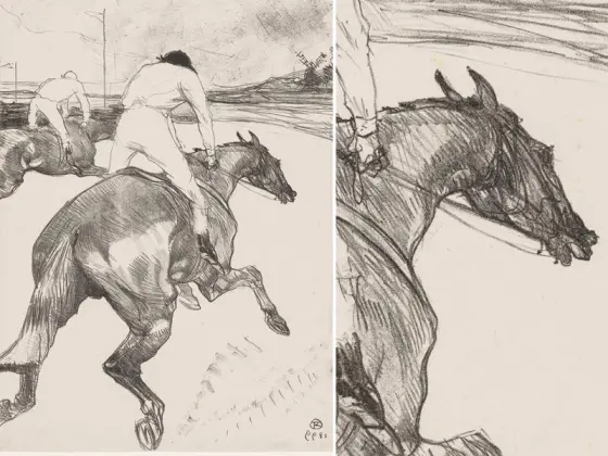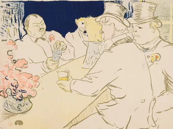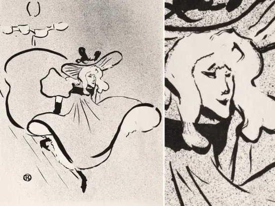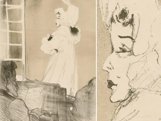 The diva of the Parisian café-concert, Guilbert was portrayed in high and low art throughout the Belle Époque. Toulouse-Lautrec portrayed the singer in her signature long black gloves and simple satin dress with deep V-neck that accentuated her thin figure and distinguished her from her heavily corseted colleagues. Here, enraptured members of the audience gaze adoringly from balconies and peep from behind the curtain.