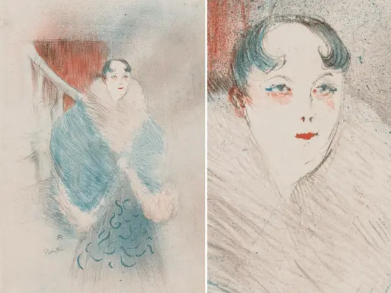 ——这位巴黎咖啡馆歌厅的巨星在美好年代期间成为雅俗艺术共同描绘的对象。罗特列克以标志性手法捕捉了歌者身着深V领缎面长裙与黑色长手套的经典形象,修身的剪裁凸显其纤瘦体态,与身着繁复束胸衣的同侪形成鲜明对比。画面中,包厢里如痴如醉的观众投来倾慕目光,幕帘后也隐现窥视的身影。