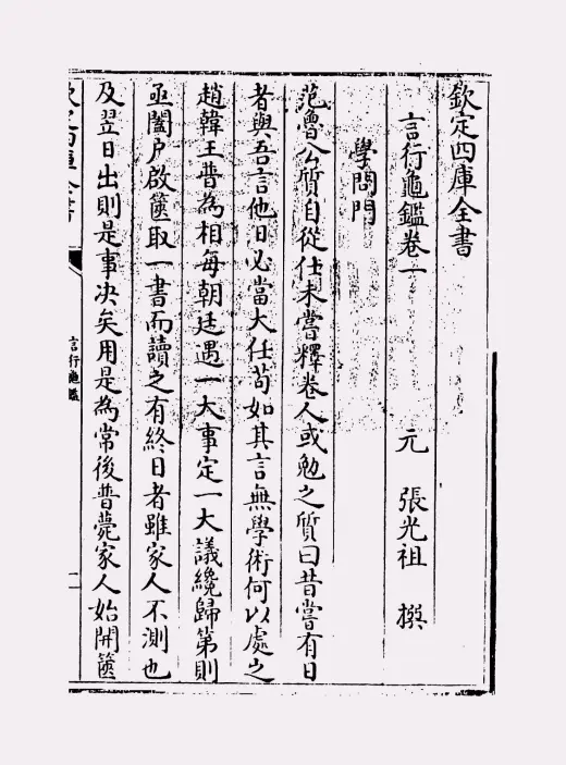 《言行龟鉴》是元代张光祖于大德年间(1297-1307年)编撰的文言文集,现存八卷。该书以宋人赵善璙《自警编》为基础,增补《典型录》《厚德录》等文献及名臣碑志编纂而成,原书散佚后经《永乐大典》保存部分内容,现存《四库全书》本,现代有整理本出版。