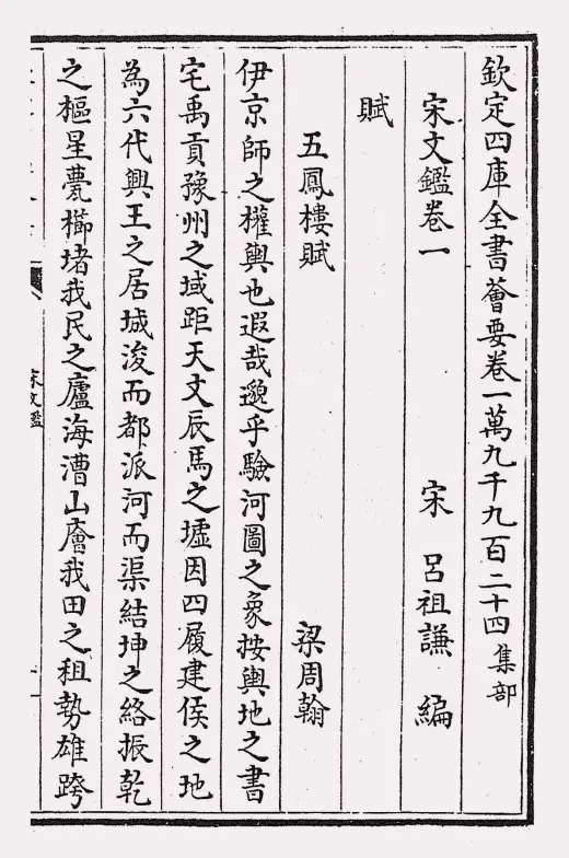 《宋文鉴》原名《皇朝文鉴》,是南宋吕祖谦奉宋孝宗之命编纂的宋代诗文总集。据吕乔年记载编纂时所得文集凡八百,全书共150卷,分61类文体,收录北宋建隆至建炎年间赋83篇、各体诗约1020篇、文1400余篇,涉及作者200余人,涵盖古赋、律赋、骚体文等多种文体。编纂过程曾引发朝野争议,兼收未广泛传诵但文采可观之作。