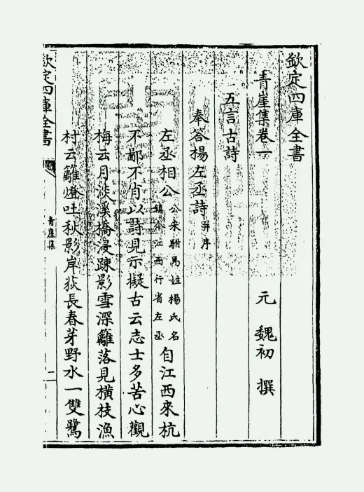 《青崖集》是元代魏初所著诗文集,原书十卷散佚,现存五卷本系清乾隆年间从《永乐大典》辑录重编。魏初字太初,号青崖,出身弘州顺圣仕宦之家,官至南台御史中丞,师承元好问并受家族交游影响。