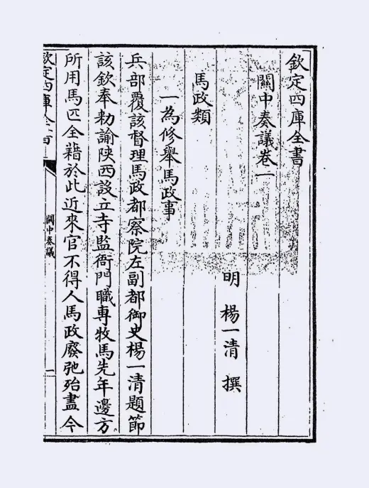 《关中奏议》为明杨一清撰。一清字应宁,号邃庵、石淙,安宁人,成化壬辰进士,历侍成化、弘治、正德、嘉靖四朝,官至华盖殿大学士,两次入阁预机务,官居一品。谥文襄,事迹具《明史》本传。此编以其生平章疏分为五类。卷一、卷二曰《马政类》,卷三曰《茶马类》,弘治十五年以副都御史督理陕西马政时所上。卷四、卷五、卷六曰《巡抚类》,则寇入花马池,命巡抚陕西时所上。卷七、卷八、卷九曰《总制类》,则正德初寇犯固原隆德,一清以延绥、甘肃、宁夏有警不相援,患无所统摄,请遣大臣领之,即命一清总制时所上。