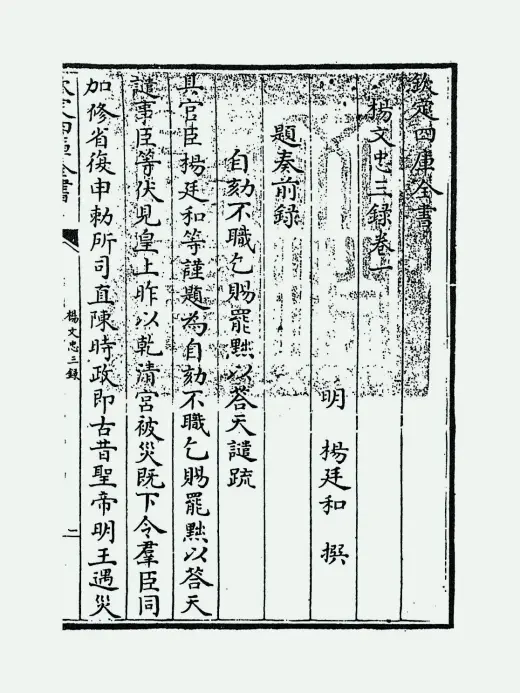 《杨文忠三录》是明代嘉靖初年华盖殿大学士杨廷和编撰的政事文献合集,收录其任职正德、嘉靖两朝期间的奏疏、政论及文书,系统反映明代中期政局演变。全书分为《题奏前录》《题奏后录》《视草馀录》《辞谢录》四部分,前两录分载两朝奏疏,后两录分别记录内阁议政细节与辞谢文书。