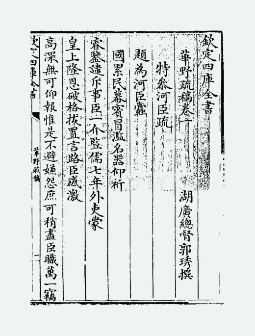 《华野疏稿》是清代官员郭琇的奏疏合集,共五卷,由其子郭庭翼于雍正十年(1732年)校刻成书,有四库全书本传世。郭琇(1638-1715)字瑞甫,号华野,山东即墨郭家巷人,康熙九年(1670年)进士,官至湖广总督。