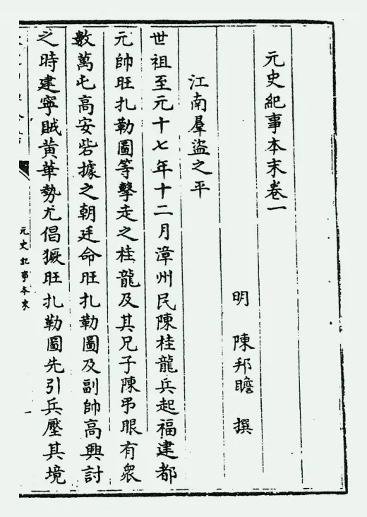 《元史纪事本末》是由明代陈邦瞻于万历三十四年(1606年)编撰的纪事本末体史书,后经臧懋循补撰《律令之定》篇,崇祯年间张溥增补史论。全书编为27目,共六卷,张溥增补史论后改篇为卷,又分为27卷。全书约10万字,内容简略。该书以事件为中心,每卷记述一元代重大史事,涵盖政治军事、科举学校、河渠漕运等典章制度,其中《治河》篇全文收录欧阳玄《至正河防记》,《律令之定》篇摘录郑介夫奏议。该书主要取材《元史》和《续通鉴纲目》,世祖朝记事达十六卷,对元代推步之法、科举学校等亦有专篇,但对元末群雄并起之事仅略述缘由。