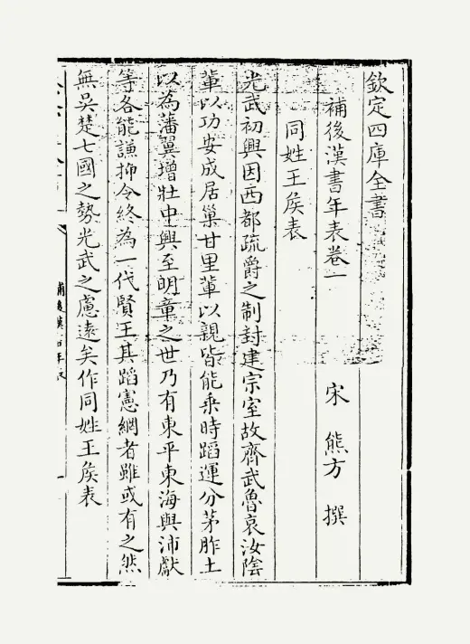 《补后汉书年表》是南宋熊方编撰的史学著作。熊方字广居,洪州丰城(今江西丰城)人,官至右迪功郎、权澧州司户参军。该书成于宋高宗年间,前后《进表》通过“皇帝陛下奋神武以拨乱”及御书《太学石经》等记载,佐证熊方为南渡初人身份。全书共10卷,包含《同姓王侯表》《异姓诸侯表》《百官表》三部分,主要弥补范晔《后汉书》未立年表的缺漏。书中仿照《史记》十表传统及《汉书》体例编纂,熊方在《补后汉书年表序》中申明补表意义,该书是目前所知正史补表类史著的草创之作,补表之学由是发端。