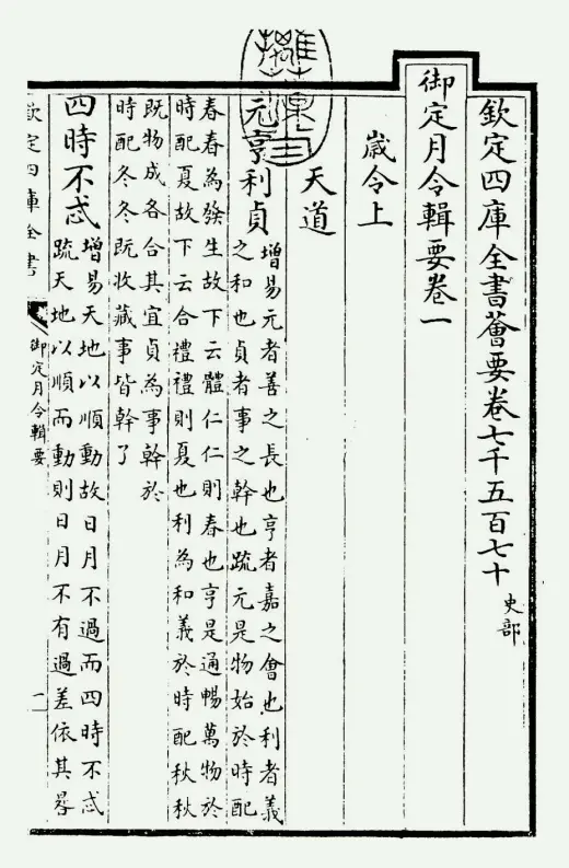 《御定月令辑要》全书共二十四卷,附卷首《图说》一卷。全书分为岁令、每月令、春夏秋冬四季令、正月至十二月令、土王令、闰月令、昼夜令、时刻令等门类。每类下设“天道”、“政典”、“民用”、“物候”、“占验”、“杂纪”等子目,每月令增“日次”子目,十二月令及闰月令增“节序”、“日次”子目[7]。卷首《图说》包含太极两仪四象八卦图、先天六十四卦分二十四气图、十二月日躔月建二十四气七十二候图、黄赤交道全图、日月五星周天图等天文历法图表。