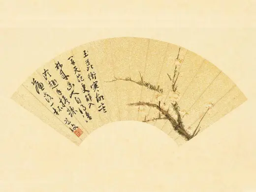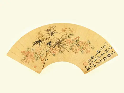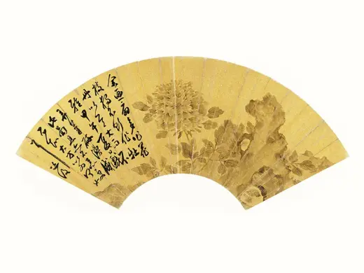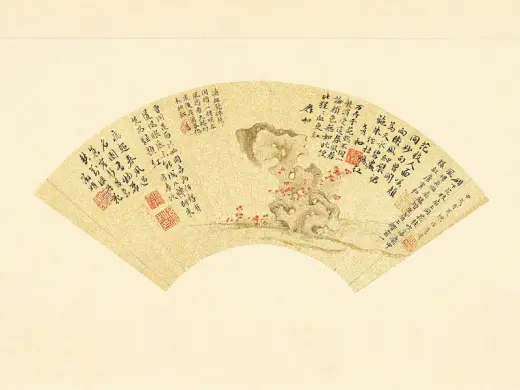 陈淳画擅长写意花卉,后人把他同徐渭(一五二一-一五九三)并称「青藤、白阳」,为明代中期吴派写意花卉画家代表。此幅画扇绘湖石旁置草本花,花朵但用朱砂细点,湖石全赖渲染,不用皴纹。画于正德甲戌(一五一四)年,陈淳是年三十二岁,属早期作品,整幅清逸细致,小巧可爱,尚见文徵明之影响。画上有数人作诗唱和,惟文徵明不和韵,或为稍后补题。