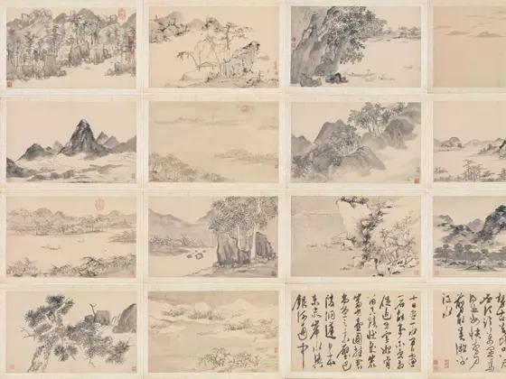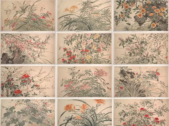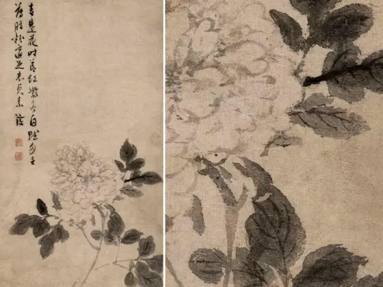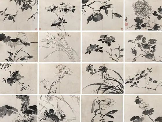 墨花图册,明,陈淳,纸本,册页,共21开,水墨,28x37.9厘米,嘉靖甲辰(1544年),上海博物馆藏。画册用笔简洁,笔势潇洒,行笔迅疾,许多花卉草虫仅用深浅浓淡的不同墨色,却能完整地表达出物象的形状及立体效果,富有生意,具有强烈的笔墨情趣。
