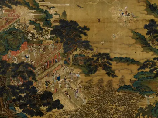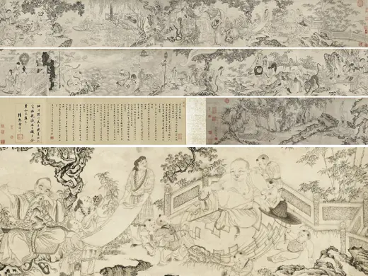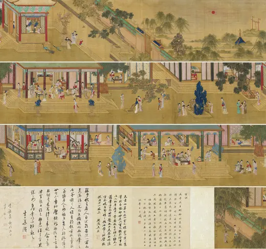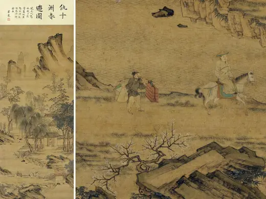 宋徽宗的驸马王诜(活动于十二世纪前半),不但擅长作画,也热衷于搜集艺术品。宝绘堂便是他特别兴筑在宅邸东边,专门用来收藏法书名画的处所。苏轼曾经受邀请在宝绘楼一同欣赏他的收藏,并为他写过一篇〈宝绘堂记〉。 仇英(约一四九四-一五五二年),江苏太仓人。本为漆工,后从周臣学画,擅长人物、山水及故事画。