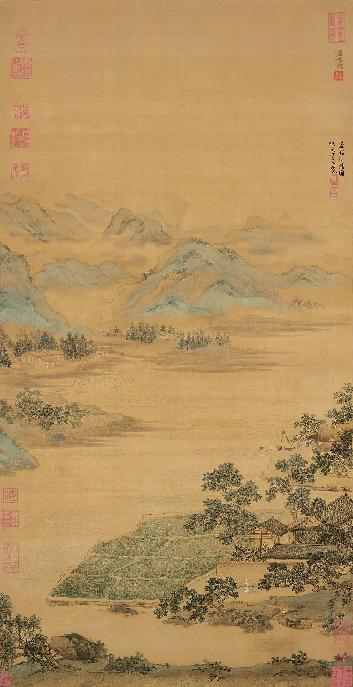 明仇英莲溪渔隐图,126.5厘米×66.3厘米,绢本设色,北京故宫博物院藏,青绿界画,描绘莲溪渔家风光。