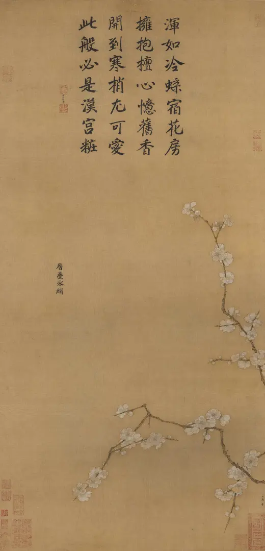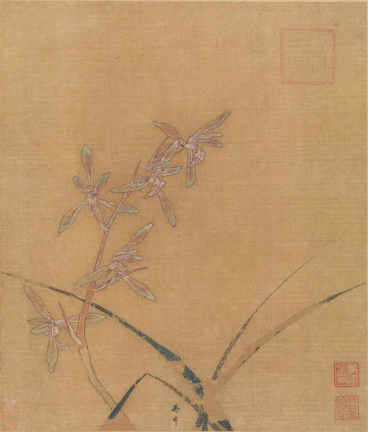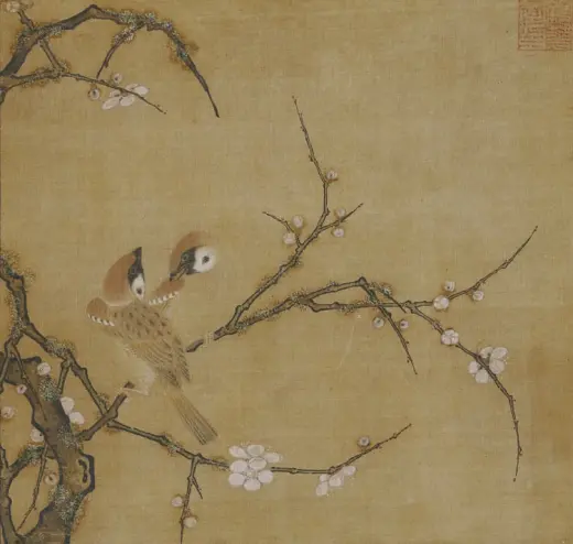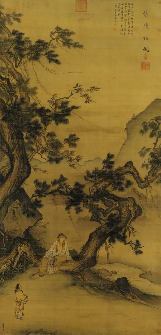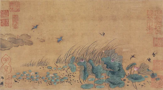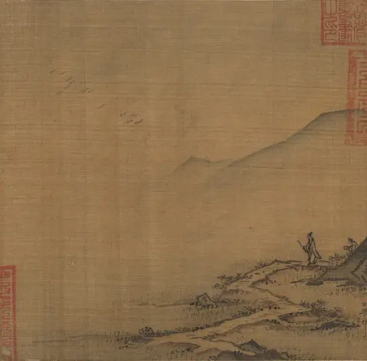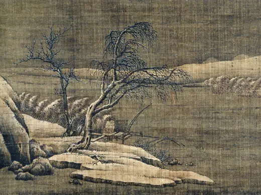 在近岸架于水上的篷子裹,一位渔夫放下拖网,静静地守着。和徐祚《渔钧图》一样,这也是描绘渔钓的作品。这种寒江渔钓题材在中国文人画中较为常见,如见于着录的唐代王维《捕鱼图》(文同《丹渊集·卷二十二》)、传世藏于台北的五代赵干《江行初雪图》、宋代范宽《寒江钓雪图》(有专家认为是李东作品)等都有多与本图类似的场景。此幅构图是较为典型的以对角线为轴,两角布景。画幅中江水将横向较长的画面分为雨块,左下岸边的枯木指向远方的河岸。比较两岸芦高矮,可知对岸并不十分遥远。此岸和彼岸均用白色表示遍地积雪,水天一色。有一点需要特别注意,以服饰的样式来看,钓者并不象是一个真正的渔者,倒象是个归隐的士人。从人物表现手法和皴法来看,此画画风更接近李迪。
