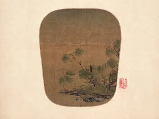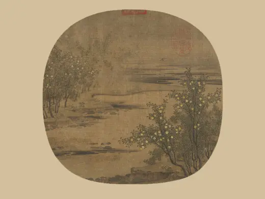 此团扇画水岸两侧遍植橙橘情景。其中橙橘树各结有繁密黄、绿果实,水渚之间则有大小椭圆卵石,色彩上有黄、褐、蓝等多样变化。坡岸染以淡青绿,再以墨笔擦染沙渚,为画面营造不少静谧情调。间有水草茂生,鹡鸰一对、水鸭二双,更添缀生意。 作者虽称赵令穰,学者多存疑。此作于小幅画面中呈现宽阔水泽岸渚景象,多被称之「小景」,是一种山水、花鸟画题尚未分流前,具有古风的写景表现。