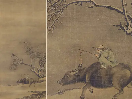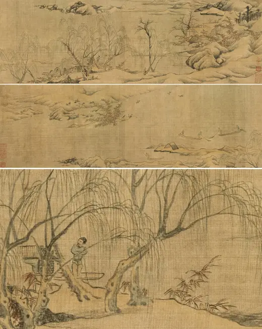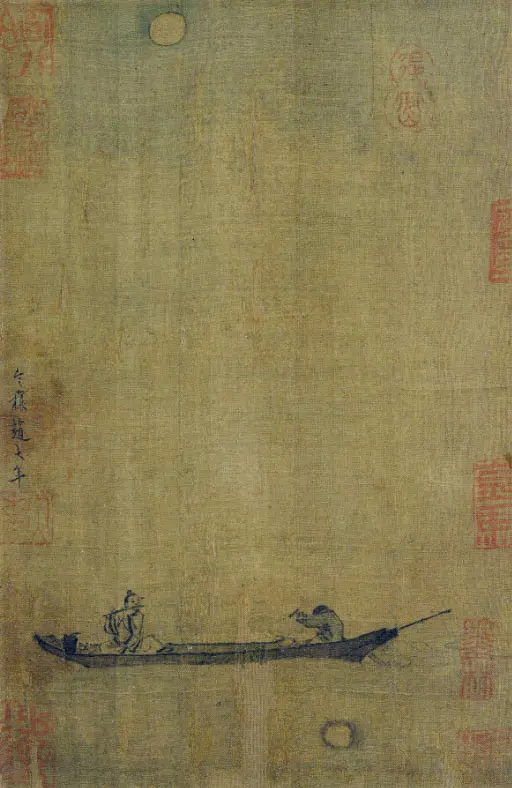 宋元集绘,宋赵令穰橙黄橘绿,页。赵令穰橙黄橘绿图绘沿溪两岸,遍植橙橘,平林野岸,水落石出。沙渚之间有鹡鸰双凫,或栖或息,陂湖烟樾,景境幽雅。幅间除橙橘树干略用墨勾勒外,馀树叶、溪石、丛苇野菊等皆用色直接点画。尽管原作因年代久远傅彩略有残退,然娟丽雅驯的设色馀韵犹存,是幅杰出宋人小青绿作品。 赵令穰(约活动于1070-1100年间)字大年,宋宗室,雅有美才高行,读书能文。画汀渚水鸟,有出尘越俗之韵致。本幅旧标为赵令穰作,然与赵氏「湖庄清夏图」卷(波士顿美术馆藏)笔墨趣味不尽相同,铃木敬教授认为是受赵令穰画风影响的模写作品,成画时间约在南宋初期。