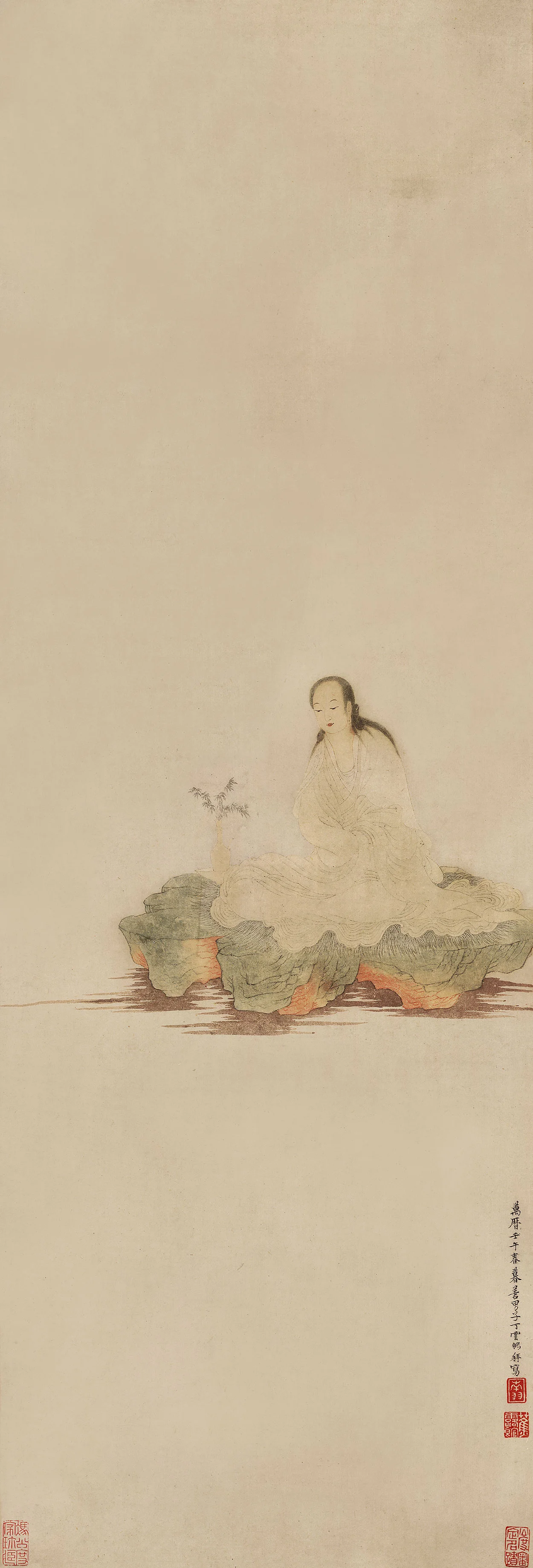 图绘观音端坐于岩石之上,眼睑低垂,两手拢袖中抱于胸前,着白色长袍,身边放一净瓶,瓶内插新竹数枝。全幅以李公麟笔法白描画观音像,施以淡彩。巨石用小青绿法,将人物置于长画幅中心,周围不画一笔,表达佛法无边之境。