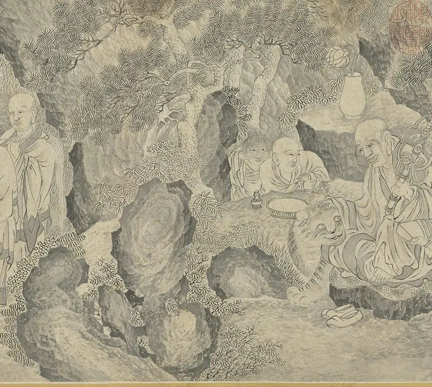水墨画层峦怪石,溪涧苍树,十六罗汉布列其中。丁氏以白描法画人物,衣纹线条时而圆转流畅,时而提顿转折,笔法变化多端。人物姿态各异,神情生动。树石皴染笔意纵横,状似随意,但功力甚深。本幅构图密实,无处留白,但全卷的墨色浓淡有致,故毫无逼促之感,诚可谓天趣自成。 本幅未署年款,从画风观之,疑为丁氏晚境之笔;又因引首有邢侗(1551-1612)题「紫逻云深」四大字,故此卷的年代下限应为1612年。
