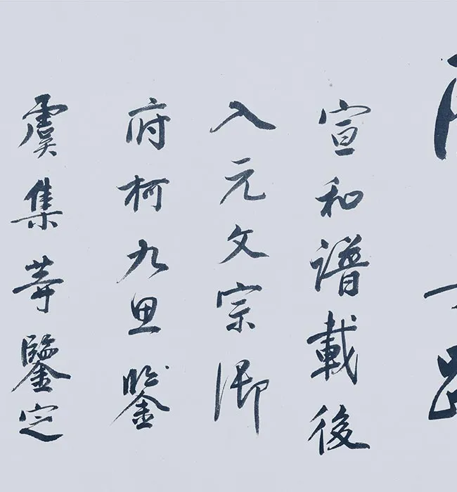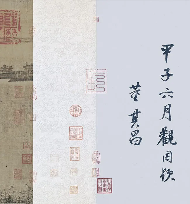 董其昌首引题跋:董北苑夏景山口待渡图真迹。宣和谱载后,入元文宗御府。柯九思鉴、虞集等鉴定。 甲子六月观 ,因题,董其昌。