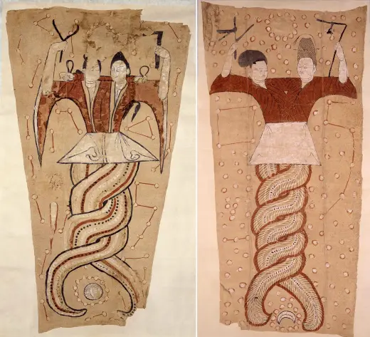 此图上彩画人首蛇身男女二人,均着窄衫小袖绛红色胡装,二人腰相连,共着一条白裙。男居左,无须,头戴笼冠,张左手执矩,矩上有墨斗(已被腐蚀)。女居在右,束高髻,张右手执规。男女上身相拥,中间两臂相连,下尾盘曲相交四节成螺旋状。两人头上有圆轮,周画圆圈以象征日;尾下有下弯月牙一,周画圆圈以象征月。画面四周面遍布大小相等的圆圈,部分以线相连象征星辰。