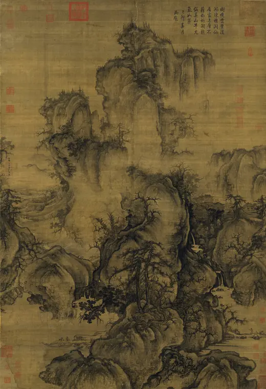 作者以粗阔扭曲的线条,描绘山石轮廓,再用干湿浓淡不同的墨色,层层皴擦出岩石表面的纹理,因为形状像卷曲的云块,所以称为“卷云皴”。树木枝干虬曲,枝桠[yā]像伸指布掌的样子,称为“蟹爪枝”,是承袭自宋初李成一系的特色。
