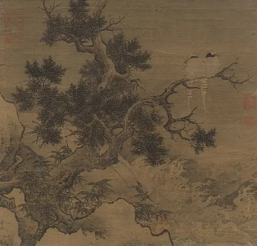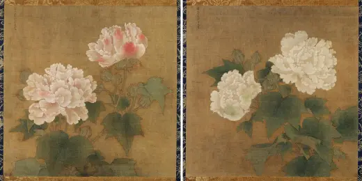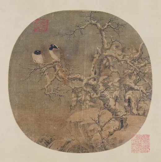 花鸟画最能展现丹青之妙。此图描绘粉红与素白两色芙蓉,亭亭立于晴空之下,风姿明净,意趣清朗,画面更透出一种晶莹剔透的质感。虽为折枝小幅,然其用线精微、设色明艳、刻画工致,既得生意盎然之趣,又不失自然物象之真,堪称画家竭尽匠心之作。通幅气韵如浥露迎风,光华焕发,晔灼照眼,令人神驰。这般精微雅致的格调,亦源于两宋一脉相承的写实传统,并彰显出当时画院体制下共通的精湛品格。