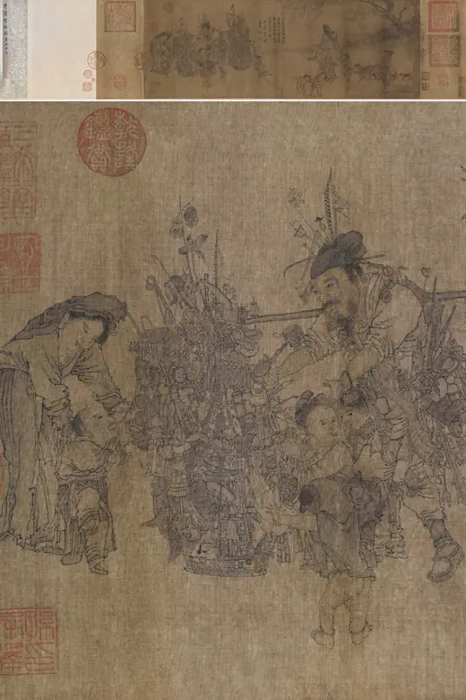 此《骷髅幻戏图》为扇面册页,左侧署有李嵩的名款,画面有“信公珍赏”“会侯珍藏”等多方收藏印章。画面中心人物是一戴幞头、穿透明纱袍的大骷髅,席地而坐,左腿曲折着地,左手按左大腿,右腿弓起,右肘支右膝,坐姿十分舒适自便。右手提控一小骷髅,应为提线木偶(傀儡),上下牙列开张,似在说笑。小骷髅即提线木偶(傀儡)右脚着地,左脚抬起,两臂做招手状,很是活泼。小骷髅对面为一小儿,其左手与双足俱着地,昂首伸右臂,似要伸手抓小骷髅,顽皮而好奇。小儿身后为一青年妇人,双手伸出似作阻拦状,表情看似有些干着急。大骷髅身后安坐一青年妇人,半袒胸,怀抱中小儿正食其乳。目光安详,稍侧身,正注视着眼前之事。人物描画十分生动细致,仿佛能听见他们各自的声音。特别是骷髅的造型十分精准。