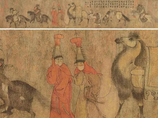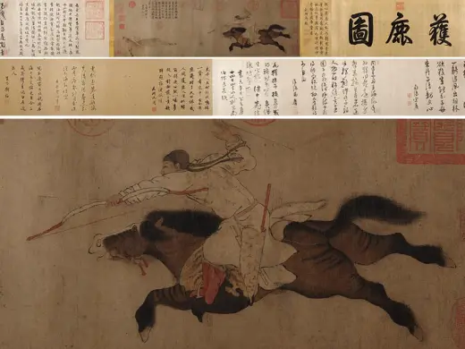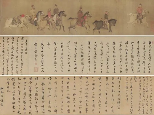 本幅无款,历来传称为辽李赞华的作品。他是契丹皇族出身,以绘契丹的贵族与鞍马而闻名。画中线条除具备描绘实物的功能外,优雅微妙的粗细变化更营造出韵律感,从构图单纯、突出笔墨、以及表现人物之个别性的特征上,都更接近于李公麟的风格。本幅作品呈现的虽可能是契丹人马,却绝非出自十世纪初的李赞华之手,其成画年代应不早于李公麟所在的北宋晚期,且曾经过汉族绘画传统的浸染。