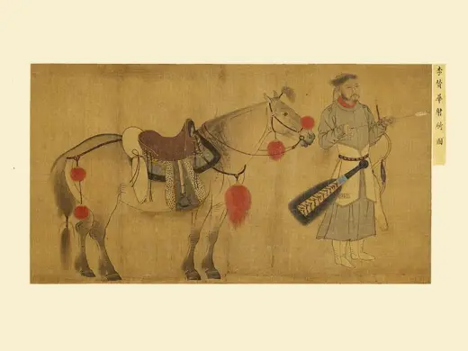 李赞华,本契丹人。辽太祖长子,名突欲。后唐长兴二年(九三一)投奔后唐,明宗赐姓李,名赞华。善绘其本国之人物鞍马。 本幅绘武士腰弓手箭,立于马前,郭若虚图画见闻志尝云:「多写贵人酋长,胡服鞍勒。率皆珍华,然马尚丰肥,笔乏壮气。」盖唐朝之后用笔有趋于细劲之倾向。