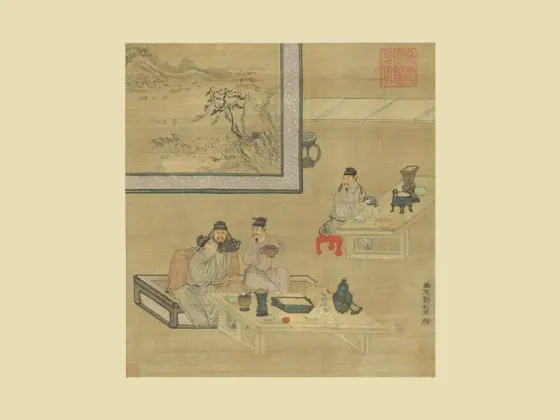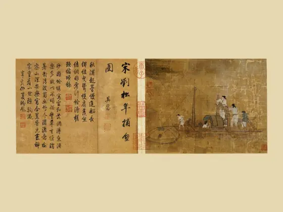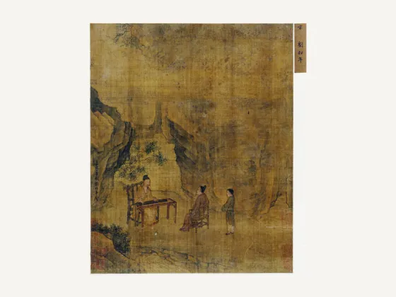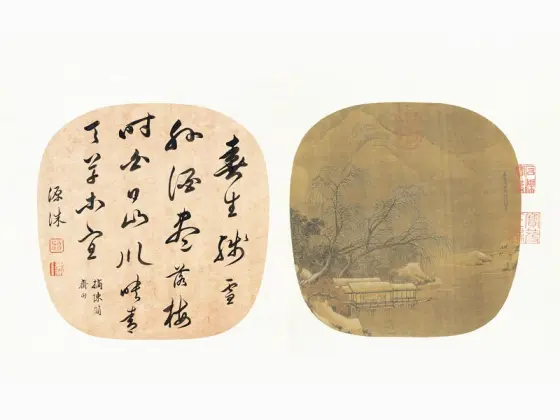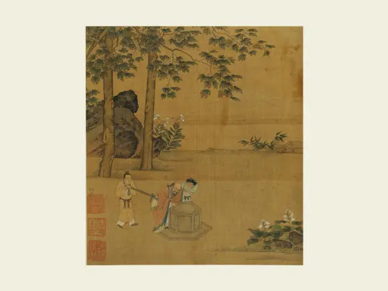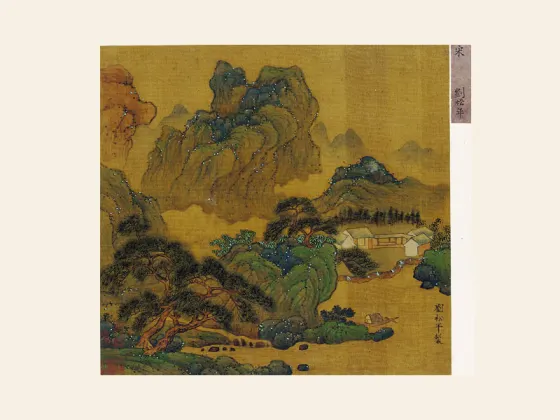 ——名绘集珍册,宋刘松年飞楼观瀑,页,刘松年,本幅35.3x30.5厘米、对幅35.3x30.5厘米,本幅绢、对幅纸,台北故宫博物院藏。