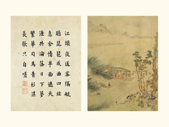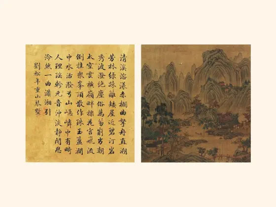 姚文田对幅行楷书:层楼峙云表,飞出茂林端。玉练排岩下,银河凭槛观。烟中悬素影,空外听惊湍。天半境高爽,寒流润翠峦。宋刘松年飞楼观瀑。