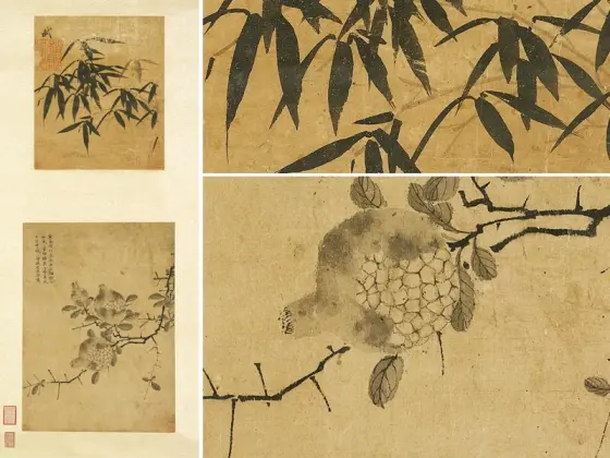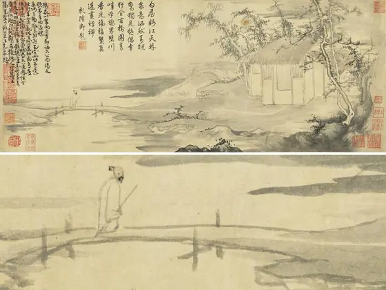山水、春景、人物、高士、船夫、山径、江河、溪涧、房舍、亭、桥、篱笆、围墙、篷舟、竹、枯树。