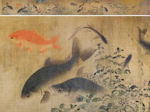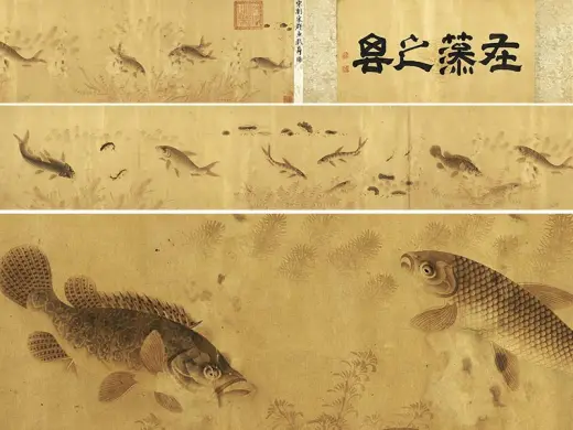 缪辅的《鱼藻图》是古人画鱼技法发展到相当成熟时创作的作品。鱼是人们较早接受的花鸟画创作题材。远古时期,人们依山傍水而居,将鱼作为果腹的一种主要食物,以捕鱼作为劳动谋生的一种重要方式。因此,鱼也就与古人形成了愈来愈紧密的亲和关系,并在新石器时代出现于彩陶器皿的内外壁上,成为一种彩陶器物的纹饰。该图是作者任宫廷画家期间,应皇室之邀而绘制的工笔画。