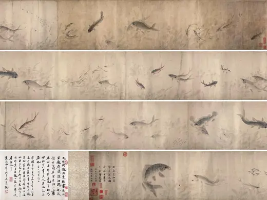 此图画法近宗边景昭,远承宋代“院体”,工笔设色,细腻、写实又富生意。鱼类无论大小,身上的鳞片皆用细笔勾出,再渲染颜色,并按照鳞片前深后浅的色彩变化逐渐减淡,甚至连鱼鳃上的细小纹路亦用细笔一丝丝画出,足见其写真之扎实功力。全图虽用工笔重彩法,但毫无板滞之感,起伏的水纹,形成动感,仿佛每条鱼都在游动着,使池水亦翻腾起来;水草用上浓下淡的墨色来表现,渐次被水淹没而越来越显朦胧,情景逼真。