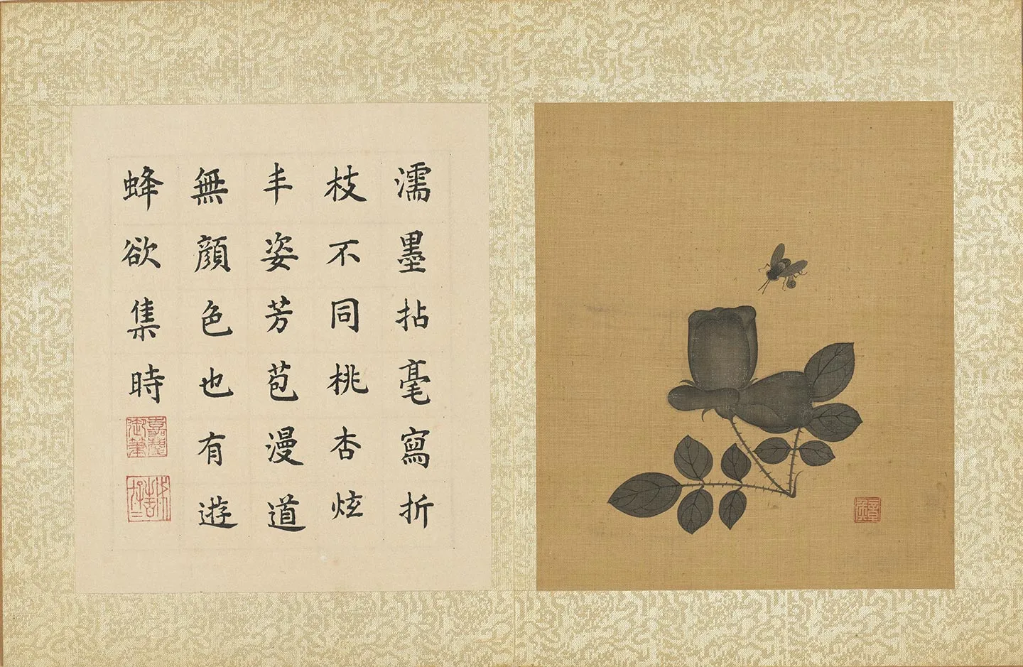 明陈洪绶杂画册,蔷薇花,页,本幅绢、对幅纸,本幅18.6x16厘米、对幅18.6x16厘米,台北故宫博物院藏。