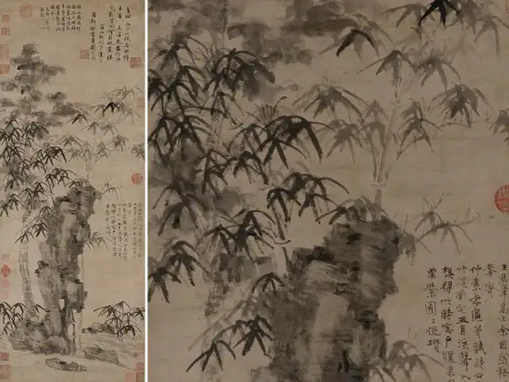 《安处斋图卷》,是元代倪瓒的代表作品,藏于台北故宫博物院。作者以擅长水墨山水为傲,所作多取材于太湖周边的优美景致。画中笔法简洁,山水意境悠远,野岸沙渚,疏林茅茨,柳树萧萧,颇有世外山野高人的遁世脱俗之感。画的右下角有作者的自题诗:“湖上斋居处士家,淡烟疏柳望中赊。安时为善年年乐,处顺谋身事事佳。竹叶夜香缸面酒,菊苗春点磨头茶。幽栖不作红尘客,遮莫寒江卷浪花。”左上角是乾隆御览后的即兴题诗:“是谁肥遁隐君家,家对湖山引兴赊。名取仲舒真可法,图成懒瓒亦云嘉。高眠不入客星梦,消渴常分谷雨茶,致我闲情频展玩,围炉听雪剪灯花。”