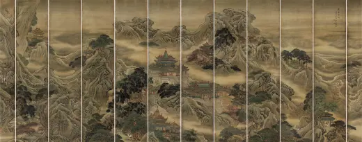 这组画屏是袁耀晚年的作品,所绘为扬州北郊的四处名胜景点,均为写生之作。 “春台明月”绘一派怡人春色,湖岸枝头新绿,垂柳依依,用笔细润秀媚,设色淡雅。“平流涌瀑”画夏日高树浓荫,茂茂森森,以浓厚的墨色点染,华滋苍润。“万松叠翠”写秋时萧瑟之意,构图平远、空明,远景山石以简笔勾勒,林木萧疏,只有常青的松树依然叠翠。“平岗艳雪” 绘冬季大地覆雪,老梅独立,神态潇洒,枝干用笔老练苍劲,再以胭脂、白粉点染敷色。画家将瘦西湖两岸的亭台楼阁、名园胜景置于春夏秋冬四季的大自然中,以传统界画的精湛技法把扬州当时“两堤花柳全依水,一路楼台直到山”的繁荣景象真切形象地展现在观者面前。(故宫博物院)