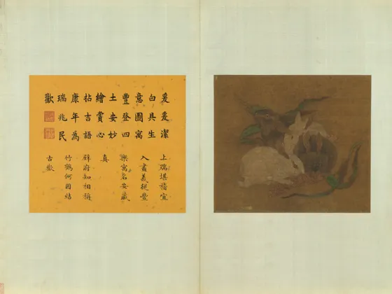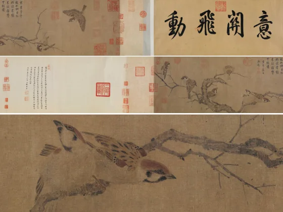 本幅绘荷叶枯黄,芙蓉展艳,一派秋光旖旎,花间鹡鸰腾跃,翡翠静静驻足,两鸿雁振翅凌空,意在千里。无画家款印,旧传为崔氏之作。