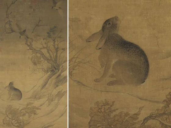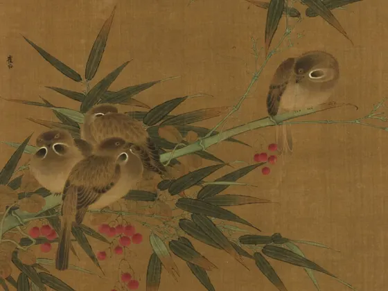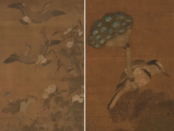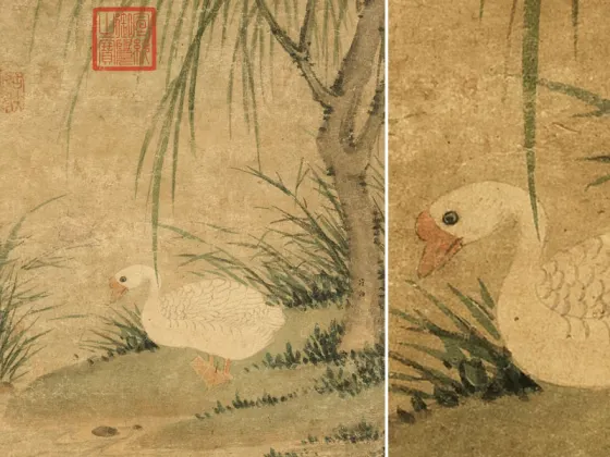 枯萎的荷叶和芙蓉出现在这幅作品中,传达了秋天的本质。翠鸟静静地栖息,鹡鸰飞来飞去,一对大雁刚刚展翅飞翔。