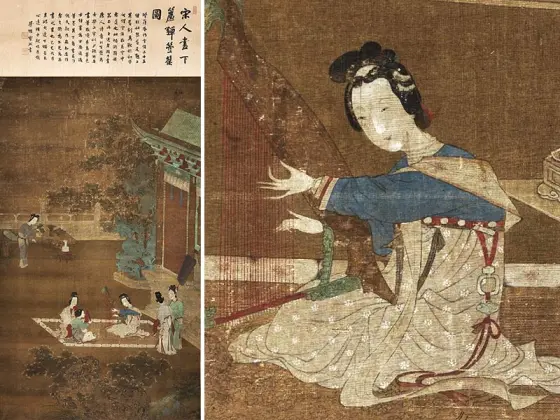 仇英工笔仕女画《双美图》轴
