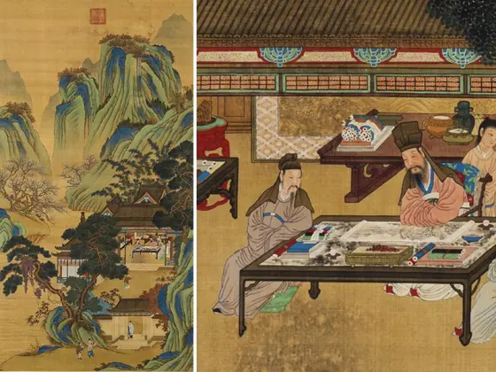 仇英山水人物画《停琴听阮图》
