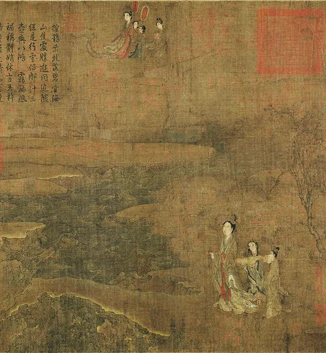 阆苑女仙图,五代十国时期,阮郜,绢本设色,纵42.7厘米,横177.2厘米,北京故宫博物院藏。《阆苑女仙图》是一幅以西王母侍女萼绿与董双成的神仙故事为题材的画卷。该画卷是阮郜唯一的传世作品。该图中,阮郜运用铁线描以平行排列地方式,将瑶池翠水的形象塑造地坚硬且有实感。