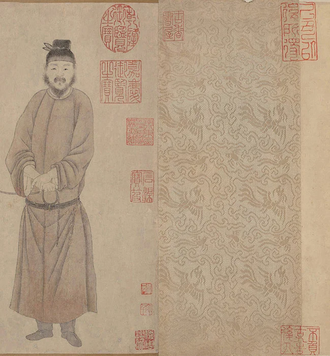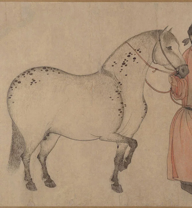 赵雍画马,精于线,法学韩干,多的借鉴了李公麟、赵孟頫的绘画风格,重视线条的多变性,遒劲沉稳是其长处。此图用笔工细,设色秀丽,形象真实生动,具有唐人风范。用笔的精神上,略显柔弱与温和,缺了开拓者的气度与果断。元人奚官拘谨,神情惶恐,圖马温顺少飞奔之势。