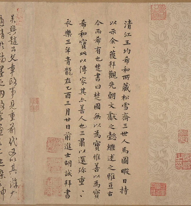 《三世人马图》由赵孟頫、赵孟頫次子赵雍、赵雍次子赵麟祖孙三人的人马图拼接而成,整幅组画自左而右分别为赵麟、赵雍,赵孟頫作品,每段画作左侧均有自题款识,卷内有胡诚、沈大年、陈安、邹诲、善住、刘岳、李君恭、袁衡、陈洪绶等诸家题跋。谓其“三老不失笔墨宗风,古来大小李将军、高家父子、米家父子之类比。”“古来父子祖孙以忠孝节义道应文学相传,不替者之类耳”。此作是14世纪以来我国不可多见的家族合作精品。
