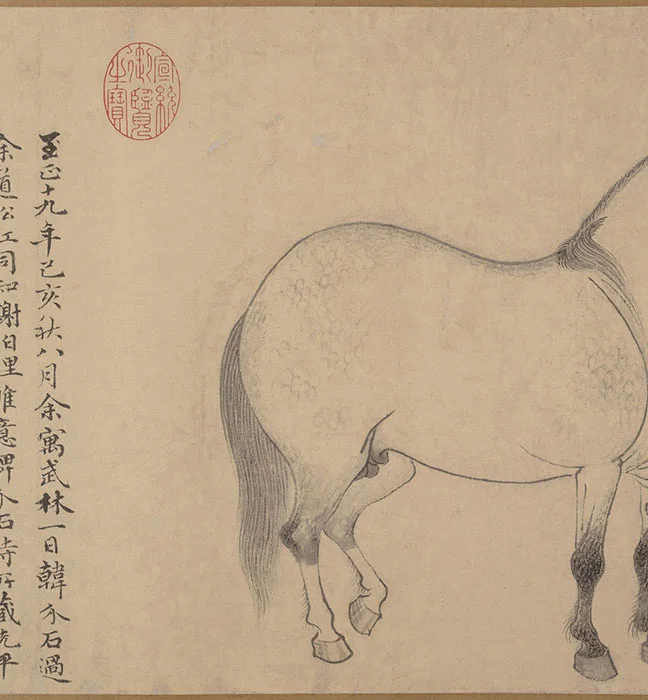 赵孟頫画马,技艺超群,堪称一绝。近学李龙眠,远学曹霸、韩幹,刻意学古,宗法唐人、直追魏晋风范,功力颇深。用唐人的铁线描运用娴熟自如;写马轮廓,线条圆润劲挺、流畅饱满,用笔谨细、力量均匀,设色得唐人富丽,亦不失文人清雅。风格凝重而古朴。画者心画,得马之真趣。也透露出画者个性情怀和柔弱秉性。虽笔墨精湛考究入微,唯马肥缺骨,过于柔媚细谨,凝重有余、生动不足,精神不够飞扬博发!