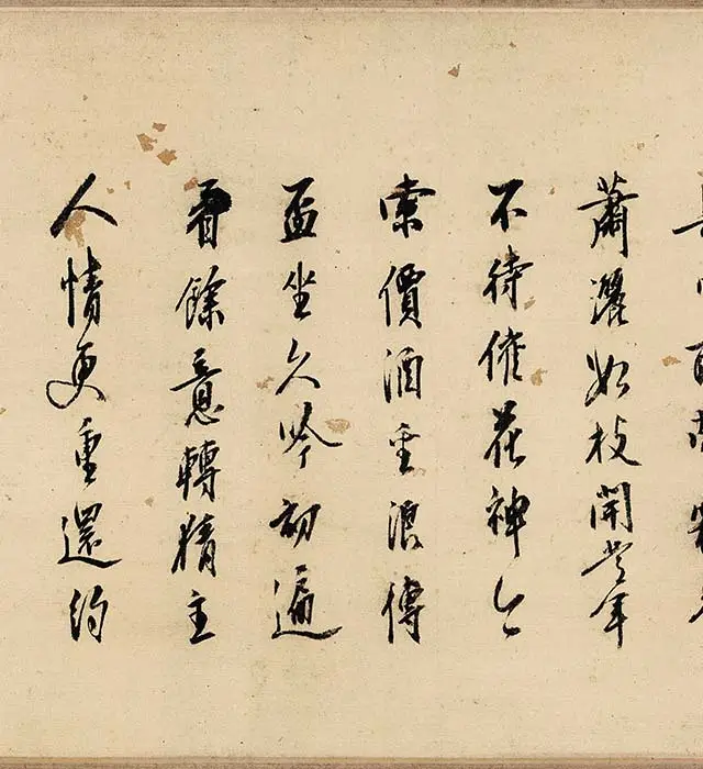盆菊幽赏图,卷,明·沈周,纸本,设色,23.4x86 厘米,辽宁省博物馆。绘一平坦幽静之处立一小亭,亭四周树木蓊郁;亭两侧摆放数盆菊花,盆中菊花绽放,红白花朵,煞是好看;亭内三人对饮,一僮持壶侍立,一派秋高气爽的意境,是沈周园林小景画代表作。该图为对角构图,卷首一侧,杂树中设一草亭,四周以曲栏隔成庭院,院里墙边有盛开的菊花若干盆。亭内三人对饮,饮酒赏菊,意态优闲,一僮持壶侍立,布势疏朗,景物宜人。此作画法谨细,笔墨精工,属沈氏中年细笔画风。