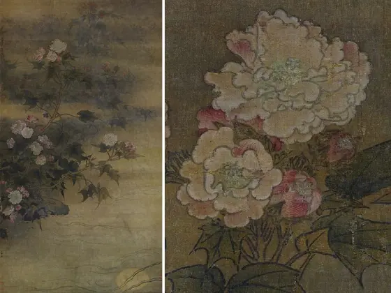 宋马麟画花卉册共8开8幅,绘蛱蝶寻芳(蔷薇)、上苑韶光(紫丁香)、御园嘉卉(玉芙蓉)、清和池沼(莲荷)、瑞露凝香(水仙、象牙红)、琼葩玉映(金凤花)、秋塘晓艳(芙蓉)、桂林爽气(桂花),技法:双钩。