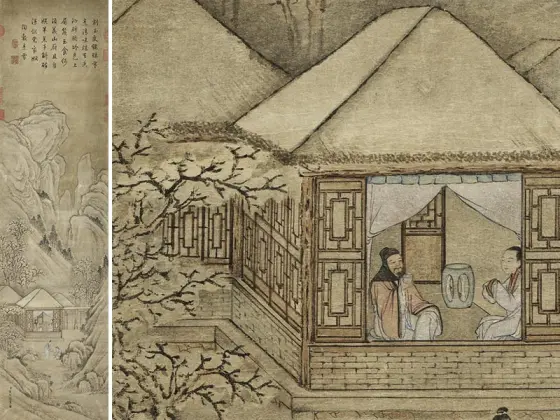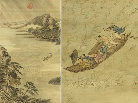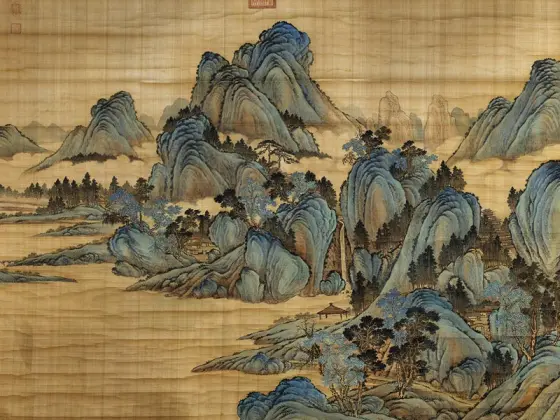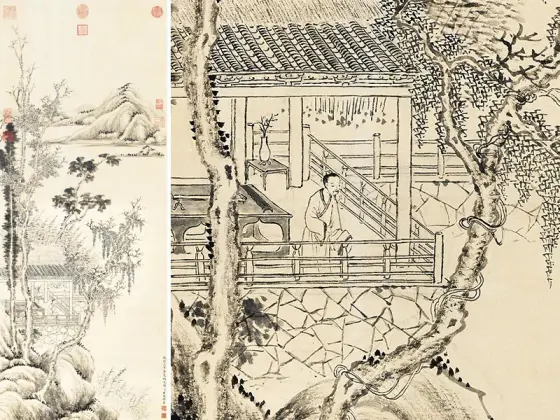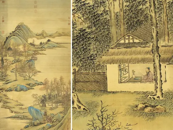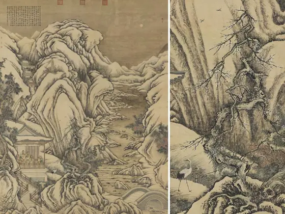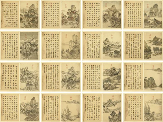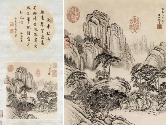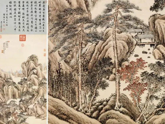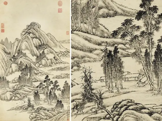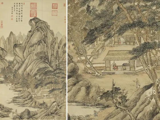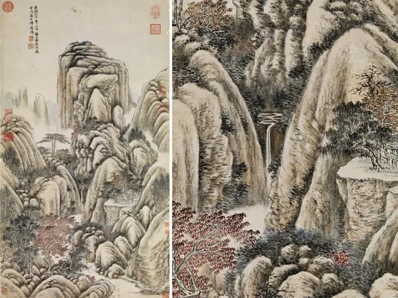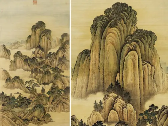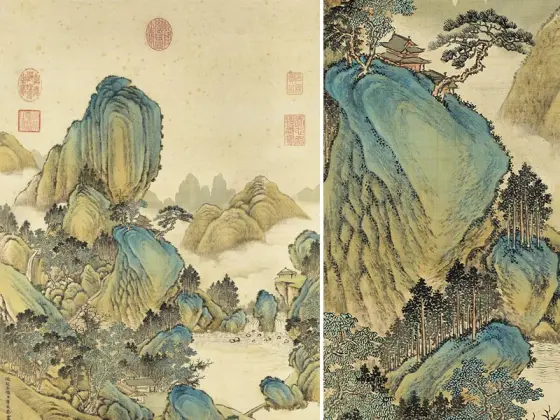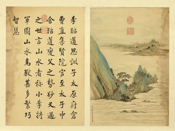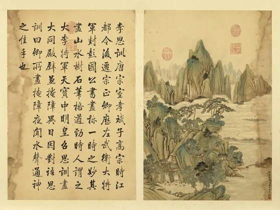 ——清唐岱画墨妙珠林(申)册,仿李昭道山水,页,唐岱,本幅63.3x42厘米、对幅63.3x42厘米,纸本,台北故宫博物院藏。