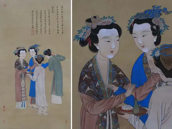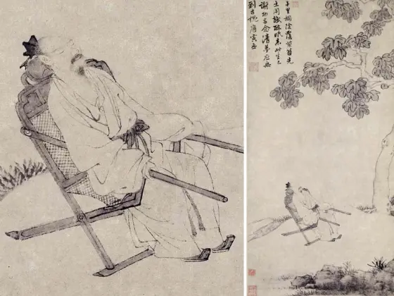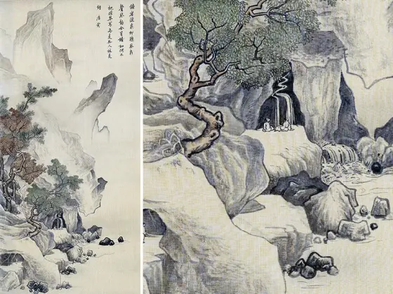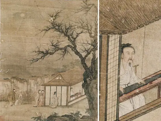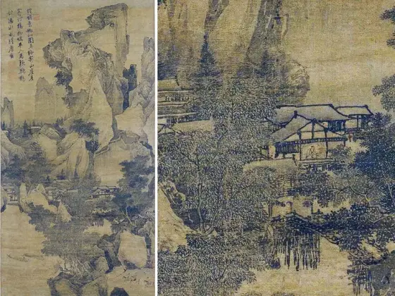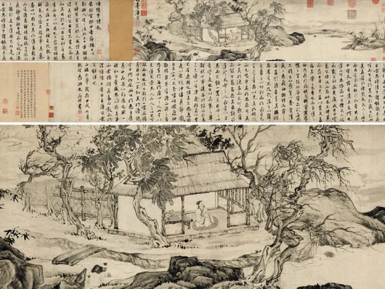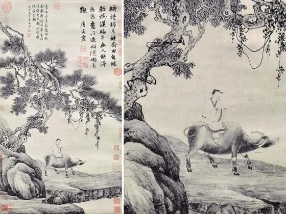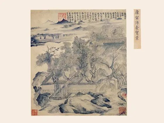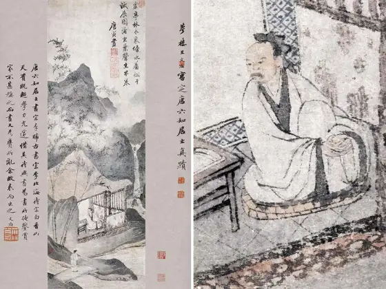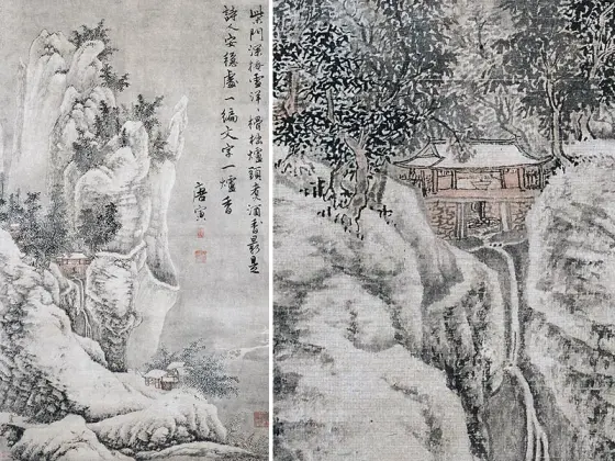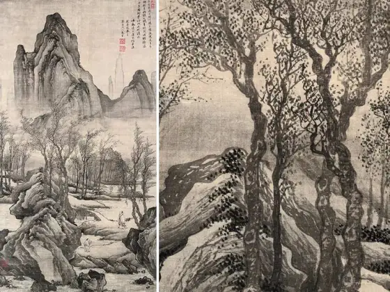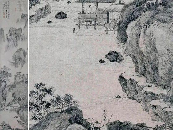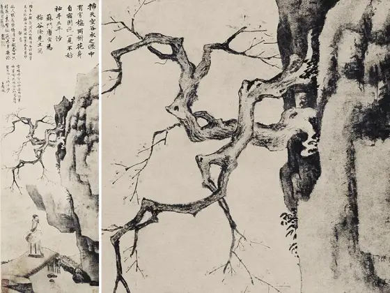 ——观梅图,轴,明,唐寅,纸本,水墨,108.6x34.5 厘米,北京故宫博物院藏。观梅图绘一位高士袖手立于溪桥之上,身后的山崖边两树梅花含苞待放,与作者所题诗意十分吻合。全幅构图汲取南宋院体风格,险中求胜,山石树木的勾勒粗细得当,晕染多于皴擦,清健爽利的笔致和幽静的背景营造突出了主体人物的高洁形象。人物的线描细劲流畅,造型清俊儒雅。从此作的创作风格上看,应是唐寅中年以后的作品。