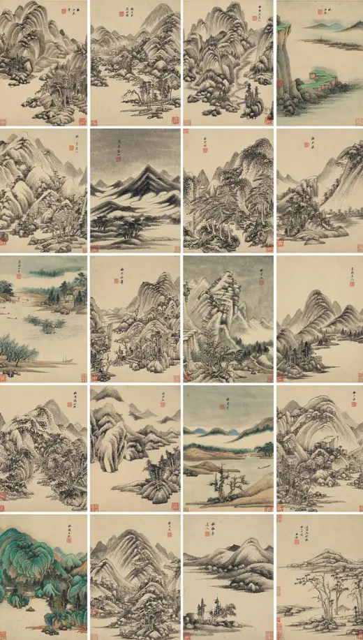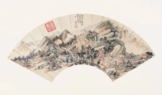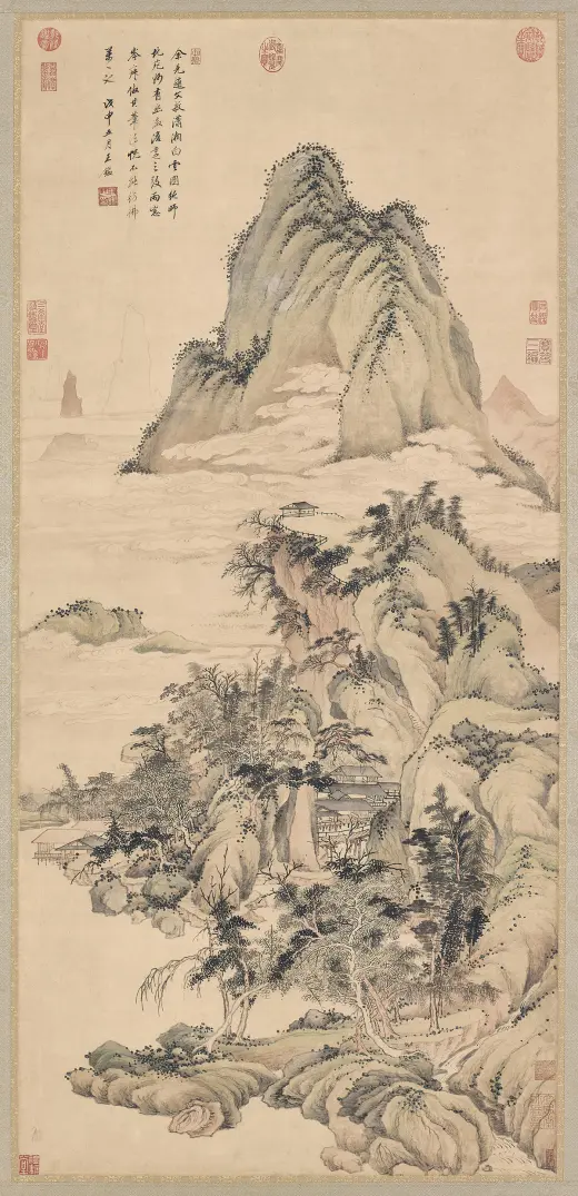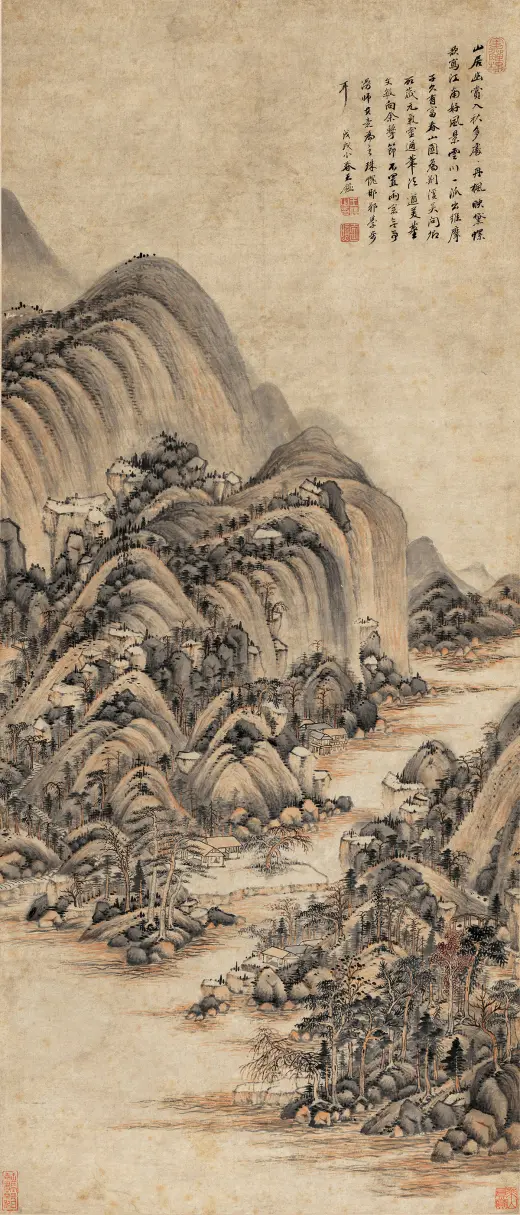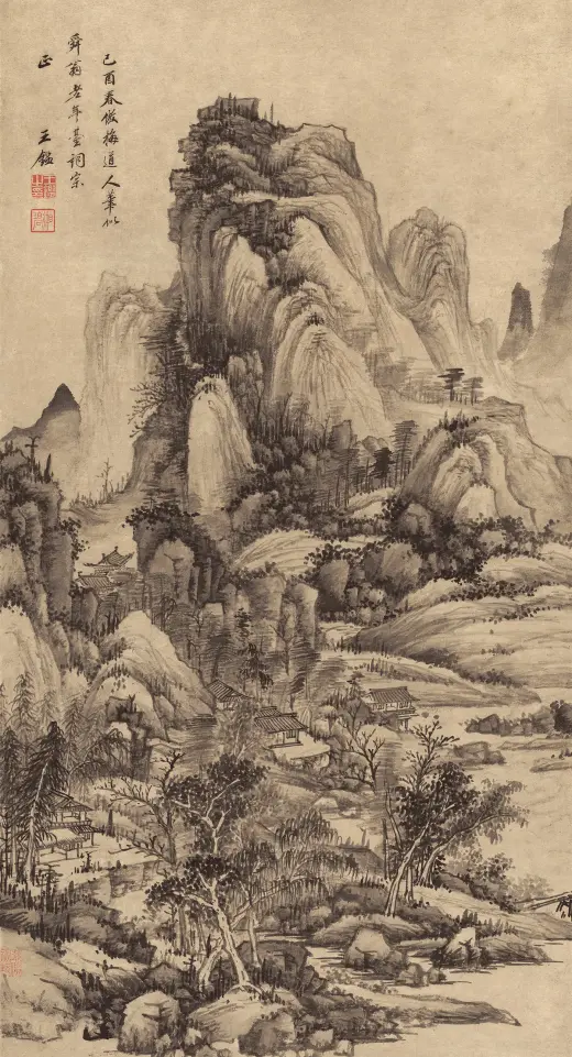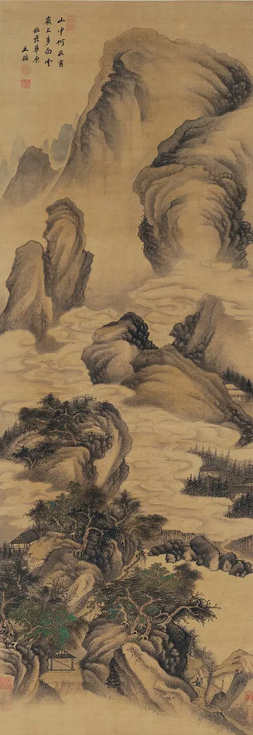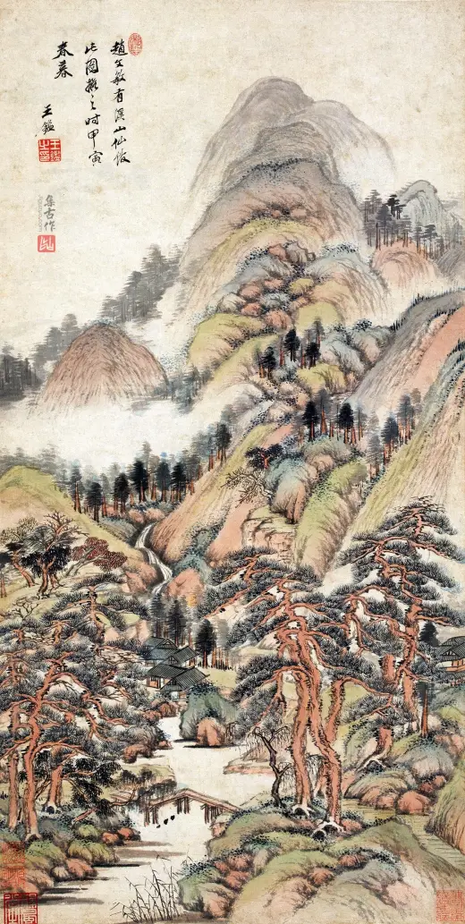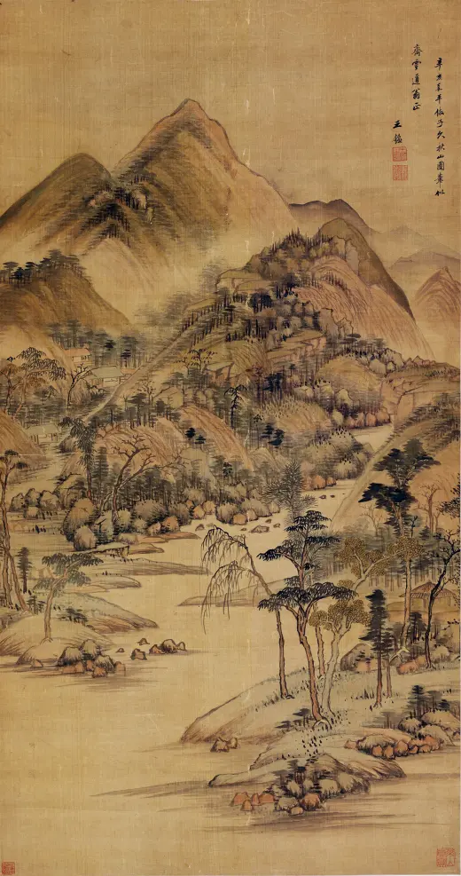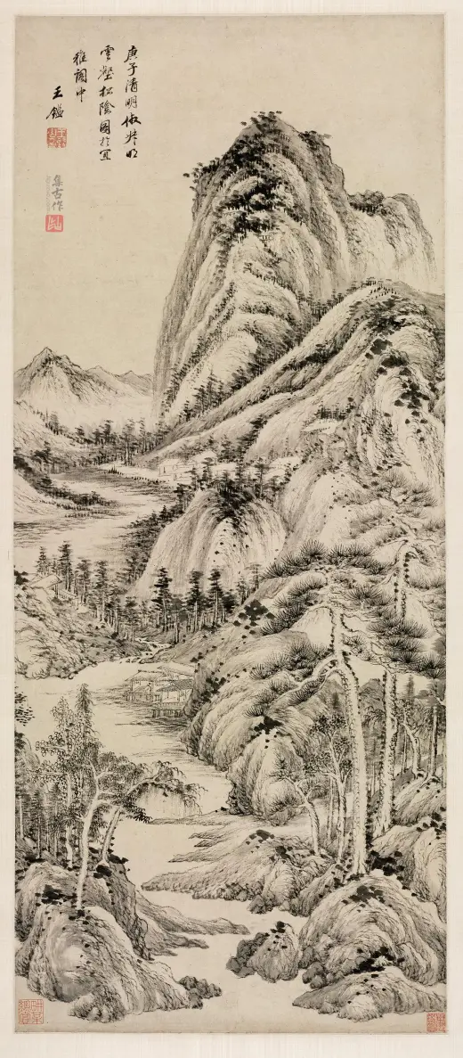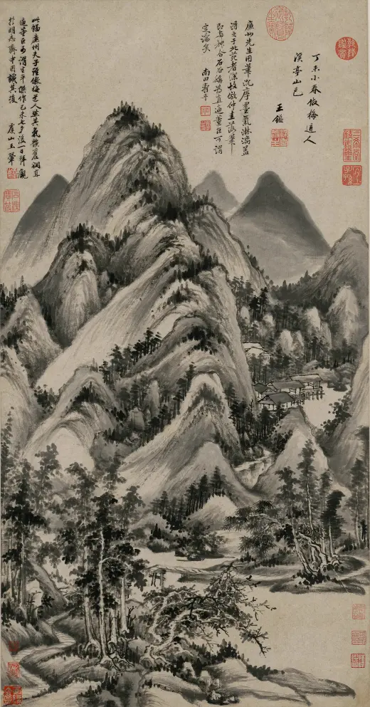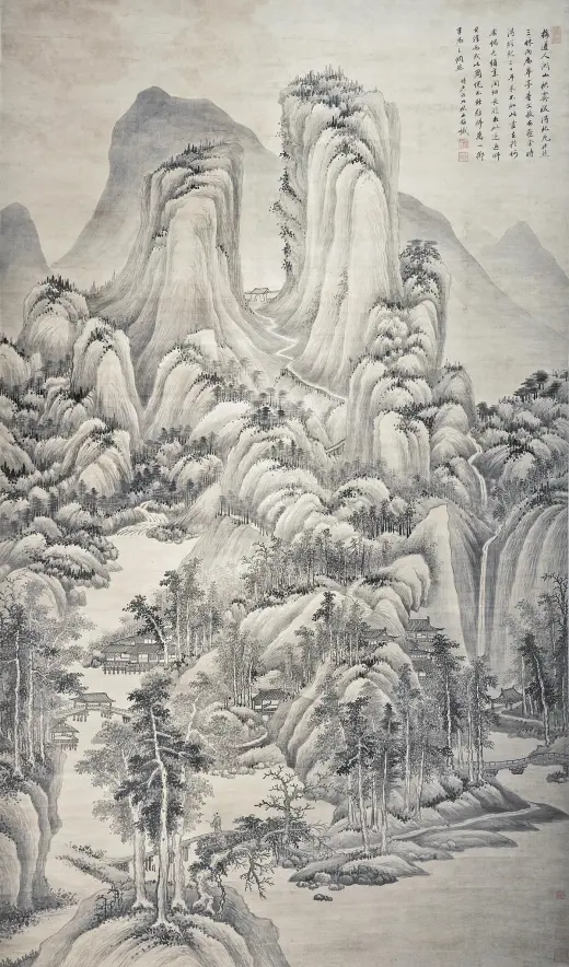 此画构图繁杂,构造与台北故宫博物院所藏《溪山行旅图》类似,以“高远”为主,近景处略带“平远”,显现出大气磅礴之势。此图用笔严谨细腻,山石垒叠、树木穿插皆有条不紊,繁而不乱,多而不赘,笔法遒美;用墨浓淡精致,水墨淋漓,墨气蓊郁。尤其是在山石的皴染上独具功夫,皴法不完全是范宽所创的“雨点皴”,其间杂有江南山水画中所特有的“披麻皴”和“解索皴”,并将南方山水画中的秀雅融入画中,可见王鉴仿古山水画的独到处。这也是其追求将内秀通过笔墨转化成精神气脉的具体体现,带有浓厚的儒家审美意趣。